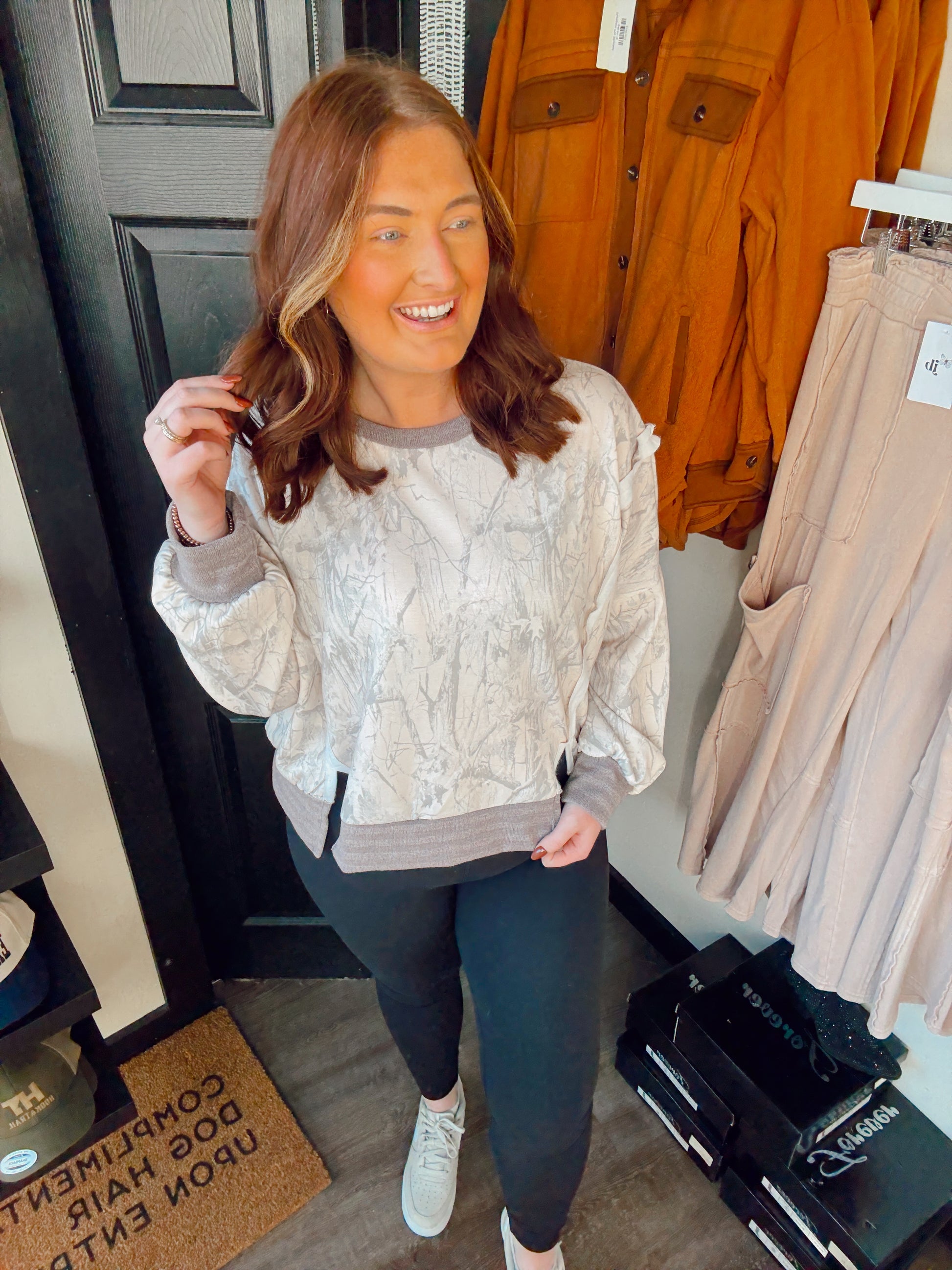 Embrace your wild side with the Cedar Smoke Crewneck—a laid-back essential that blends taupe and grey wash camo for an effortlessly cool vibe. This cozy crewneck sweatshirt pairs perfectly with your favorite jeans or joggers, whether you're running errands or hanging with friends. Soft, comfortable, and undeniably stylish, it's the kind of piece that makes you feel good while looking great. Perfect for layering through the seasons or wearing solo when the weather calls for it.