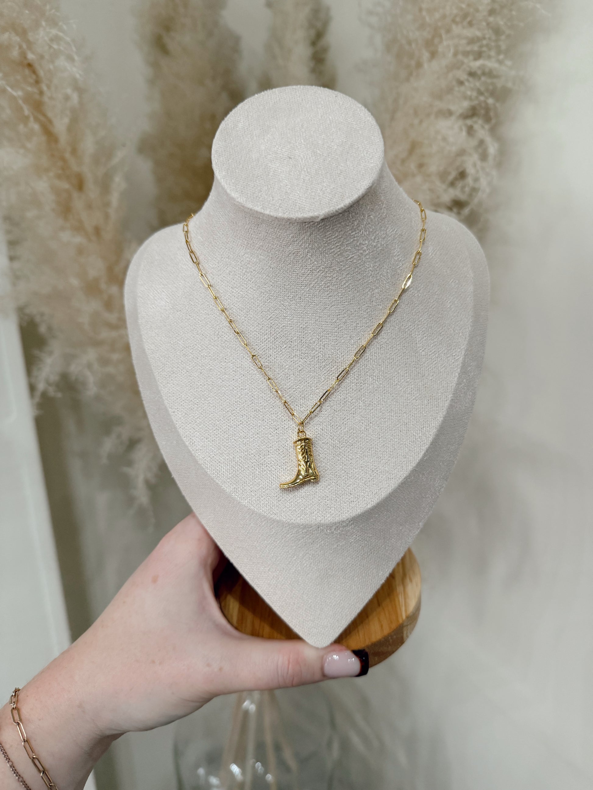 This stylish necklace features a beautifully molded and engraved cowgirl boot pendant that is perfect for making a fashion statement. With its detailed design and trendy look, the Golden Cowgirl Boot Necklace is sure to be a go-to accessory for any outfit. 16” long with a 2” extender Gold plated Stainless Steel, tarnish and water resistant Lead and Nickel free