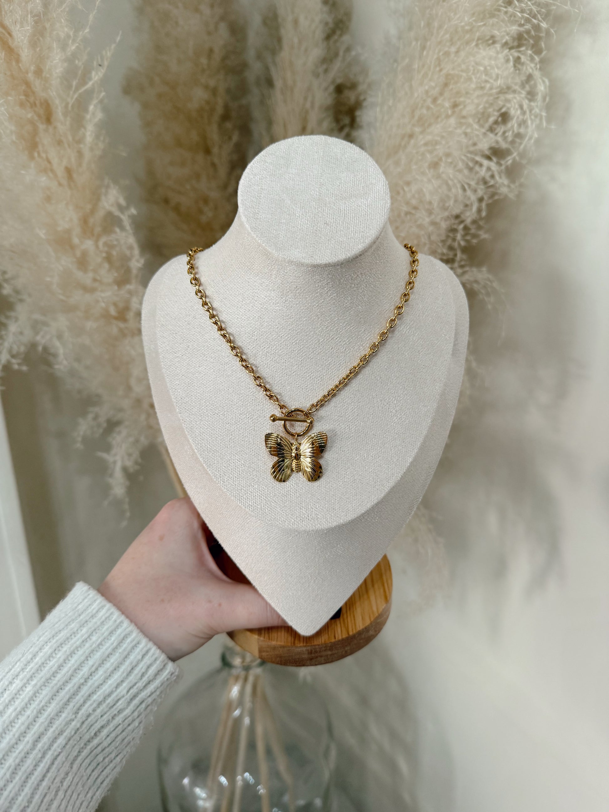 This necklace features a stunning vintage butterfly design, perfect for adding a touch of elegance to any outfit. The solo toggle closure adds a modern touch to this classic piece. Adorn yourself with timeless beauty with the Vintage Butterfly Solo Toggle Necklace. Dimensions: approximately 18” long 18k gold plated stainless steel, tarnish and water resistant Lead and Nickel free