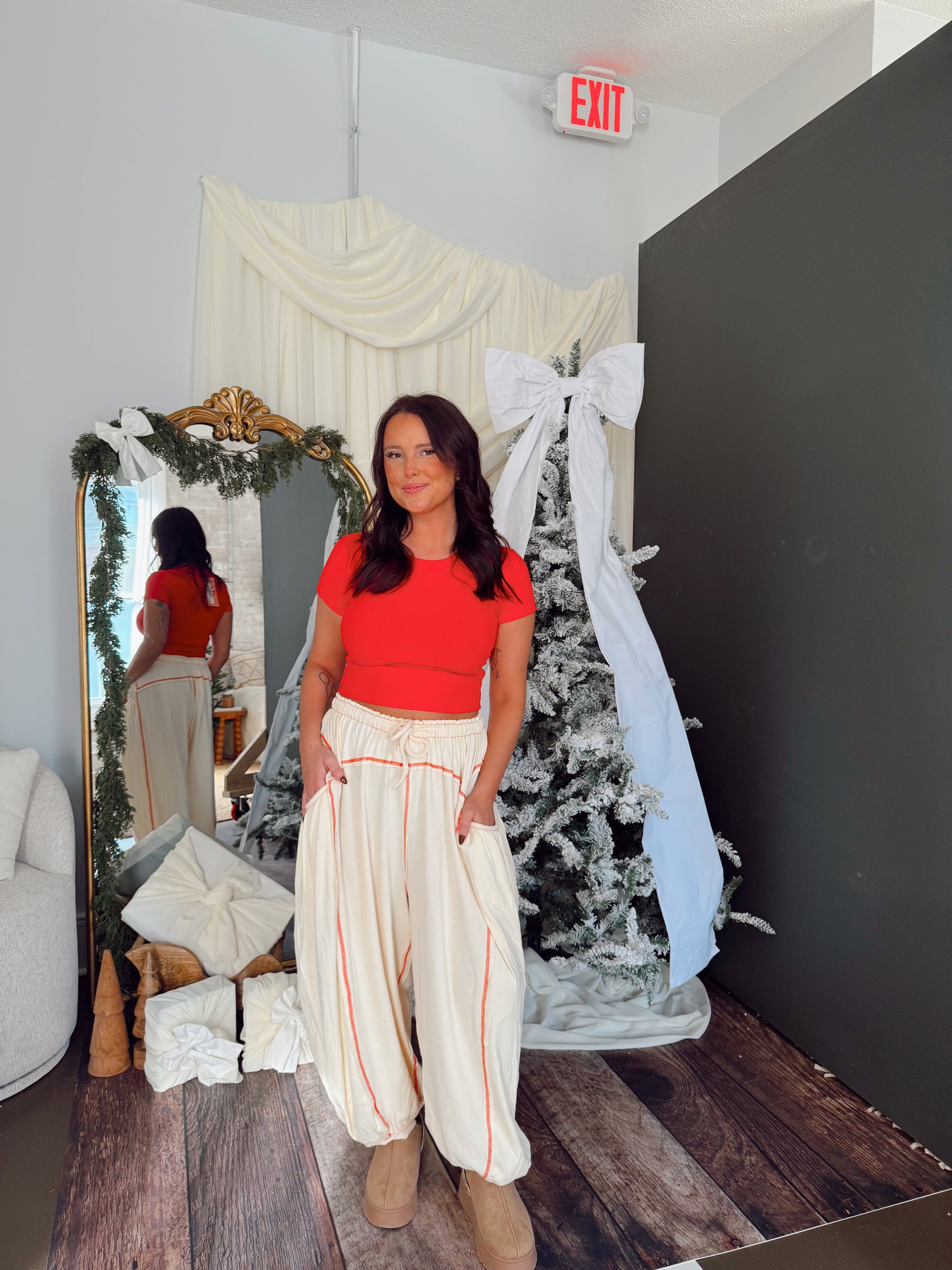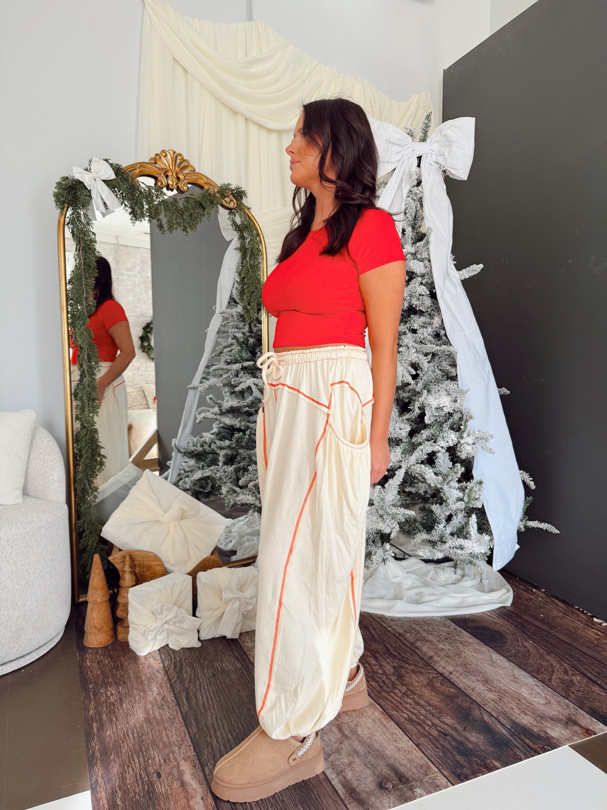 Overlock Stitch Solid Thermal Double Gauze Rib Mix Pants. Cream color pants with red stitching.