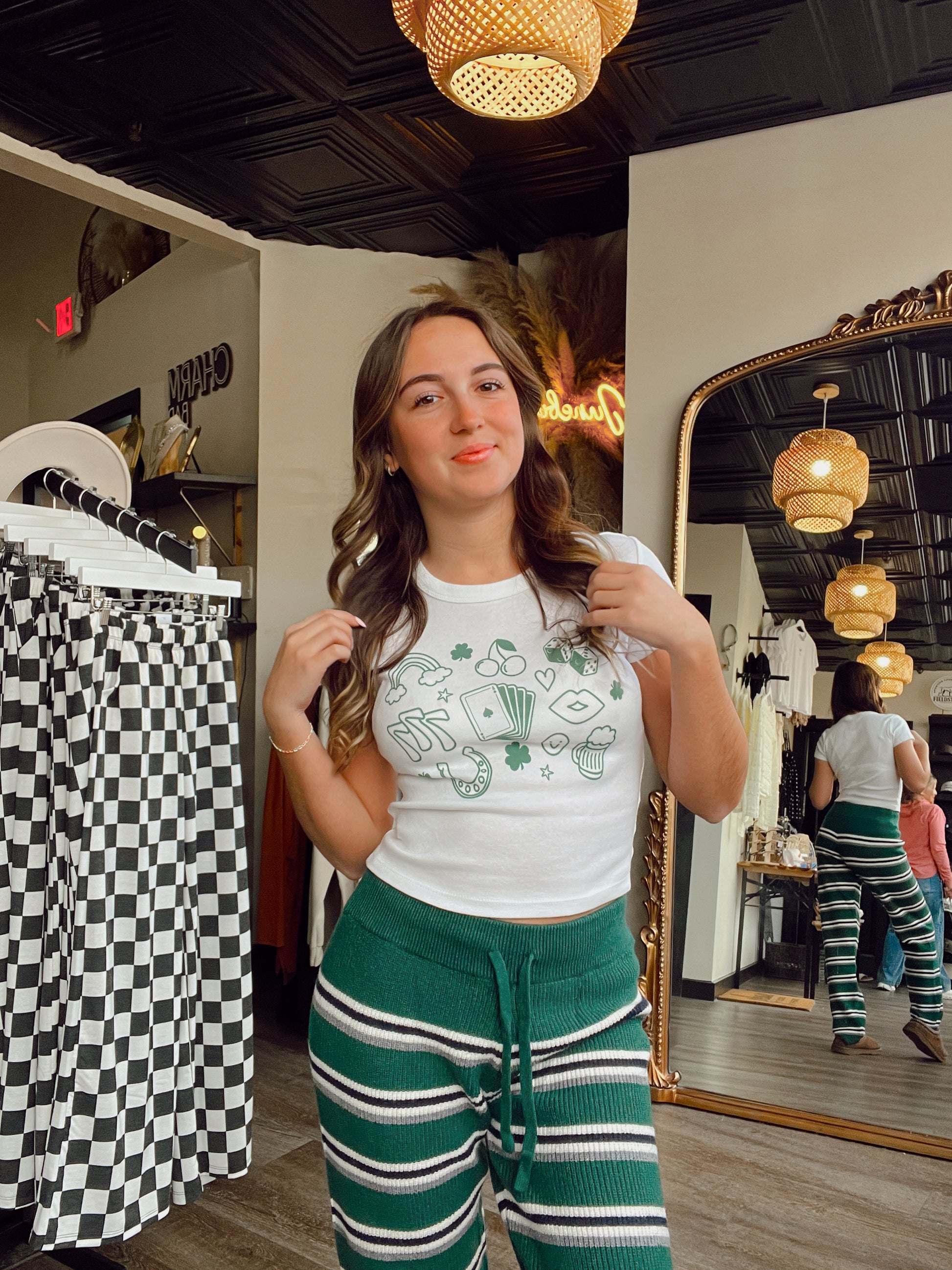 Celebrate good fortune with this charming white baby tee adorned with playful St. Patrick's Day-inspired charms in vibrant green. The design features lucky symbols including a horseshoe, rainbow, four-leaf clover, dice, cherries, stars, and a deck of cards—perfect for spreading joy and festive spirit. Soft, comfortable fit ideal for casual wear or holiday celebrations. A fun way to embrace the luck of the Irish any time of year.