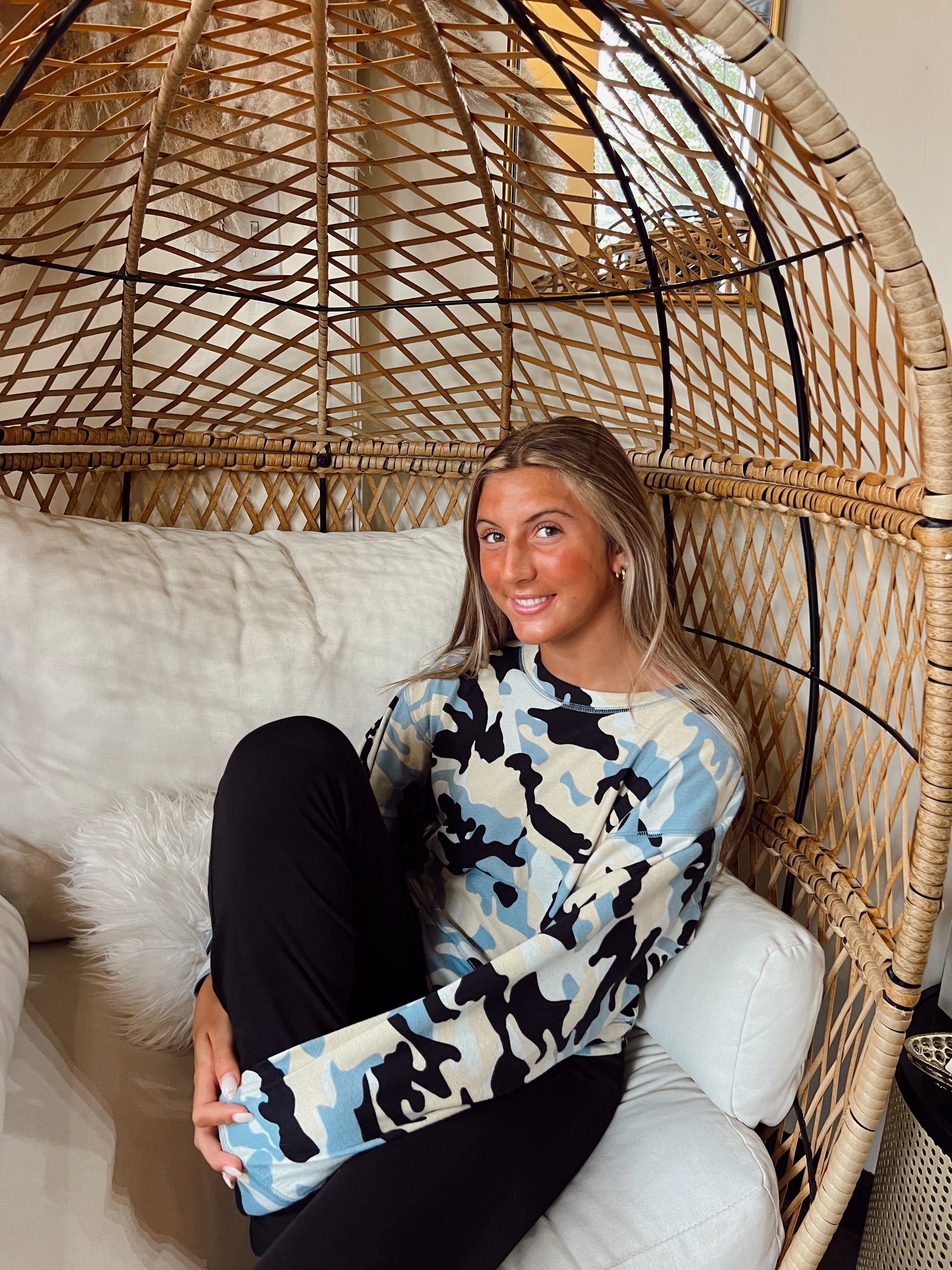 Stay cozy and cool with this Smoke Blue Camo Sweatshirt! Its smoky blue camo pattern adds a fun twist to your casual look, while the soft crewneck design keeps you comfy all day long. Perfect for lounging or making a stylish statement on the go!