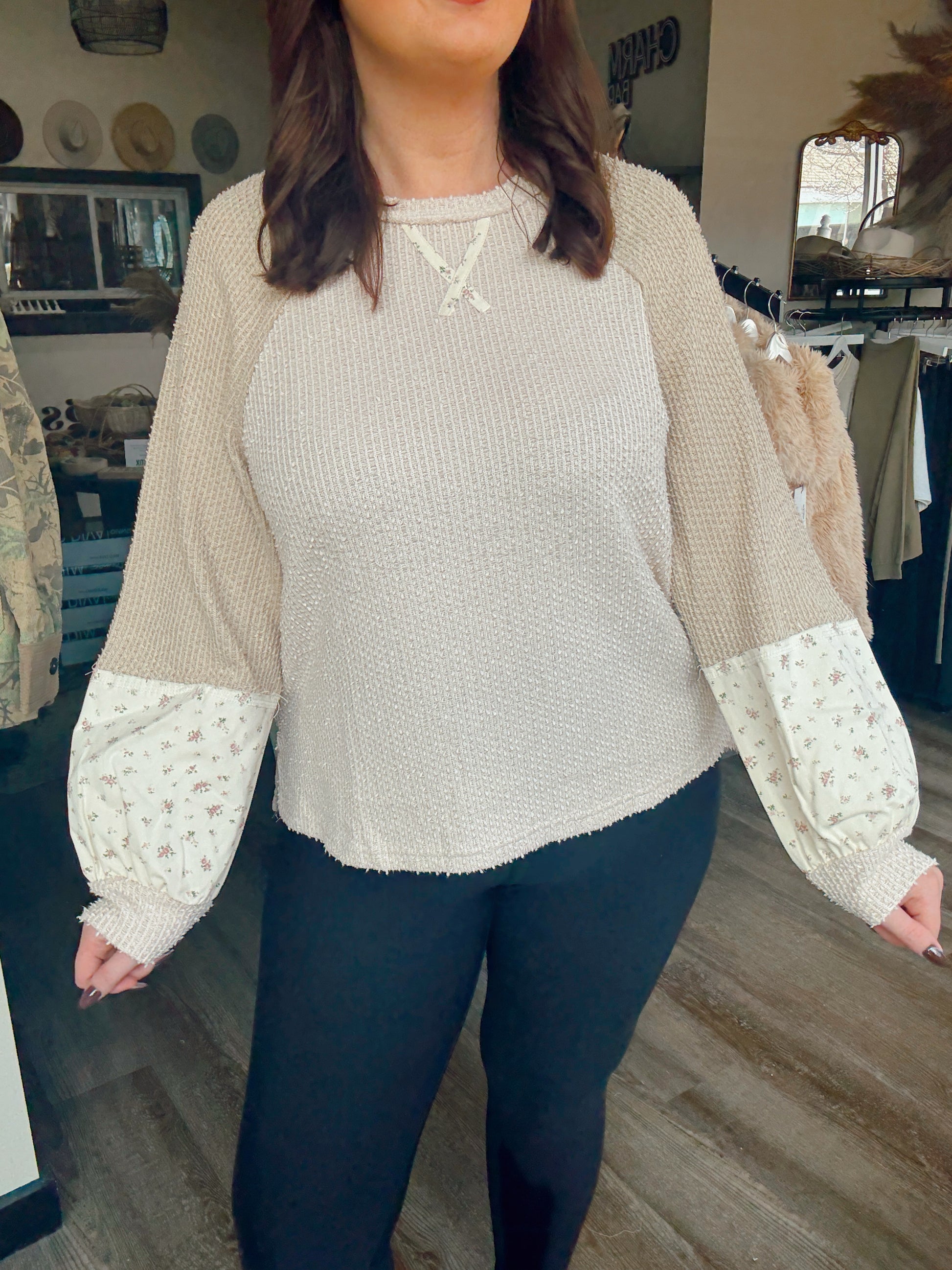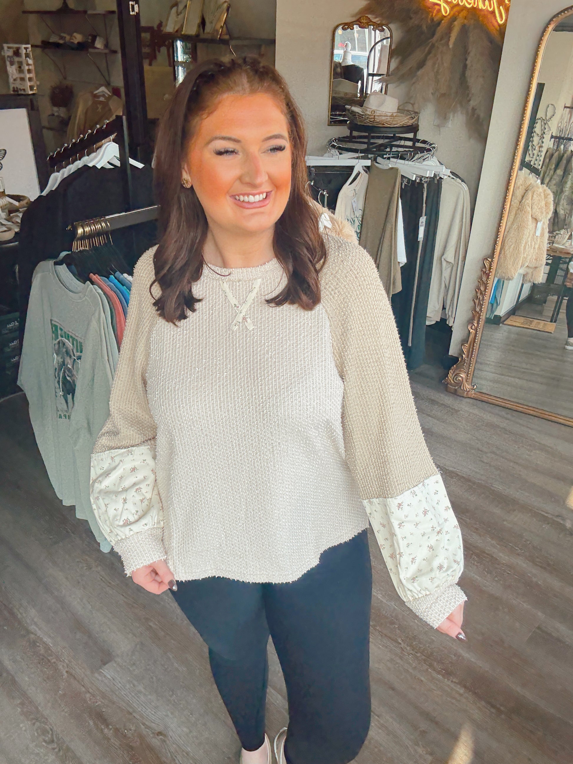 Introducing the Taupe Thea Textured Top—your new go-to for effortless style with a twist! This long-sleeve patchwork beauty blends cozy textures with unexpected floral pops that'll have you feeling like the most interesting person in the room. Perfect for layering or wearing solo, it's the kind of piece that makes getting dressed actually fun. Mix it with your favorite jeans, skirts, or leggings and watch the compliments roll in. Because life's too short for boring tops!