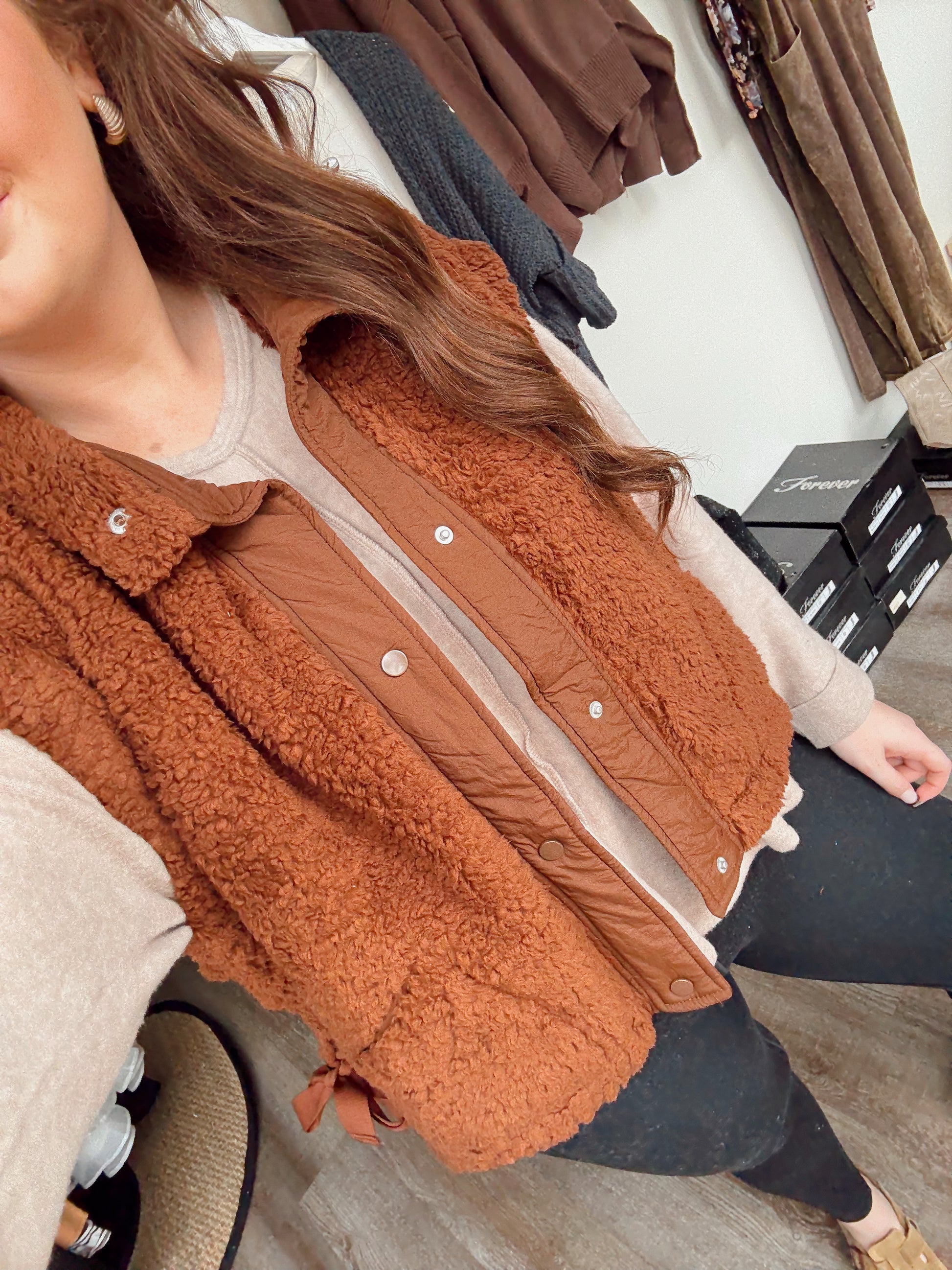 Wrap yourself in cozy charm with this oversized brown faux fur vest. Perfect for adding a fun, luxurious layer to any outfit, it keeps you snug while turning heads. Whether you're brunching or strolling, its plush texture and roomy fit make comfort your new style statement. Go ahead, be boldly cozy!