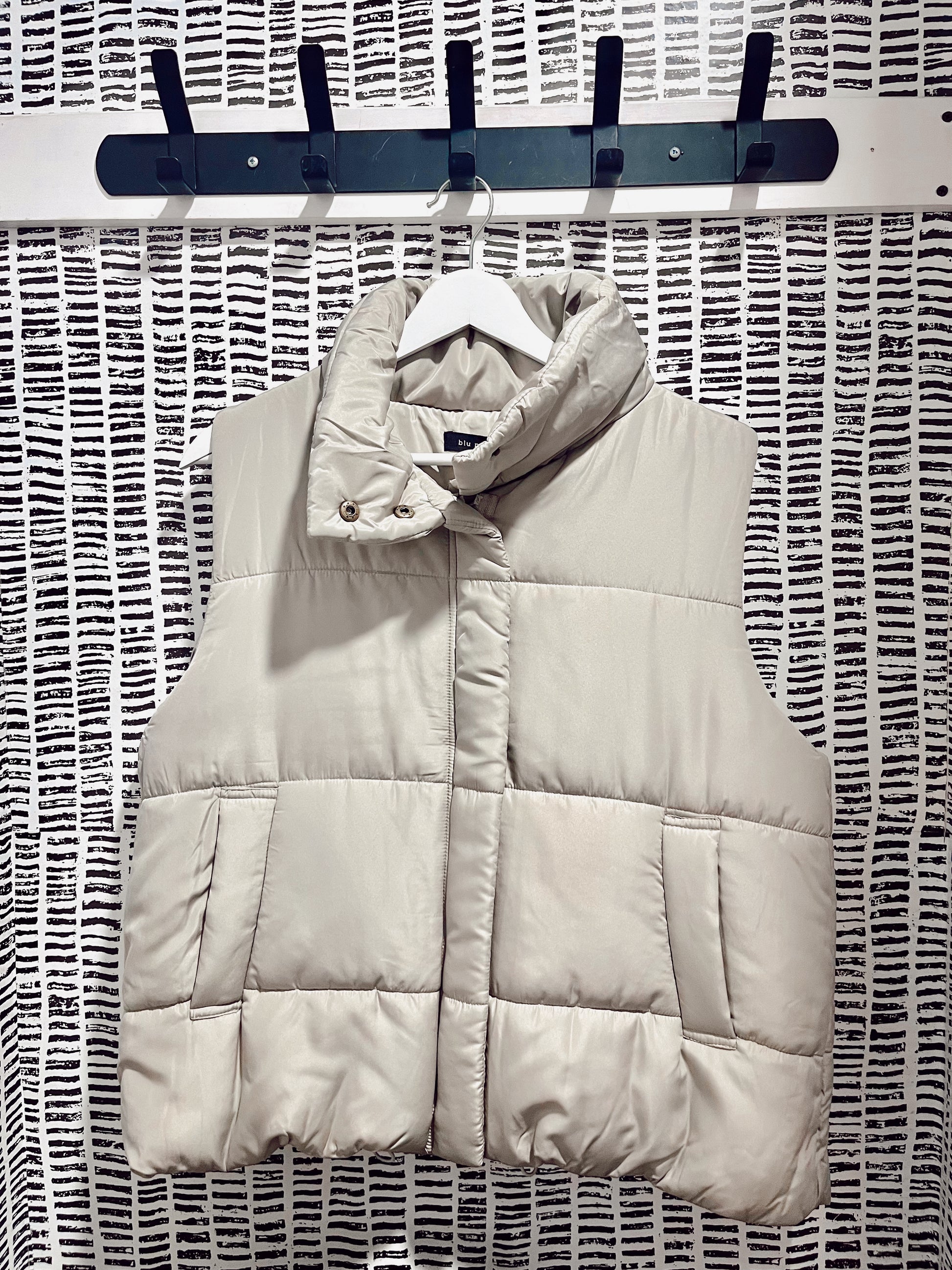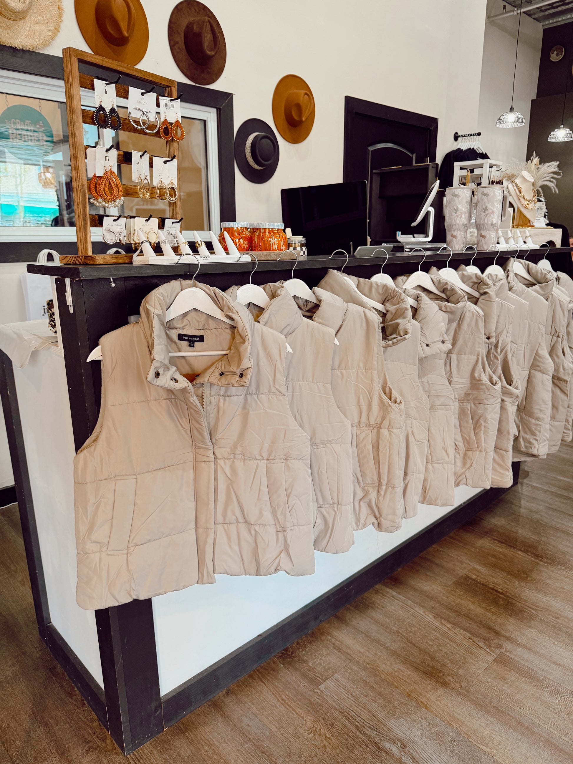 Stay cozy and stylish with the Valerie Puffer Vest in a versatile taupe shade. This zip-up vest features a snap collar neck for extra warmth and a fun twist on classic outerwear. Perfect for layering on breezy days, it adds a playful pop of comfort to any outfit while keeping you snug and ready for adventure.